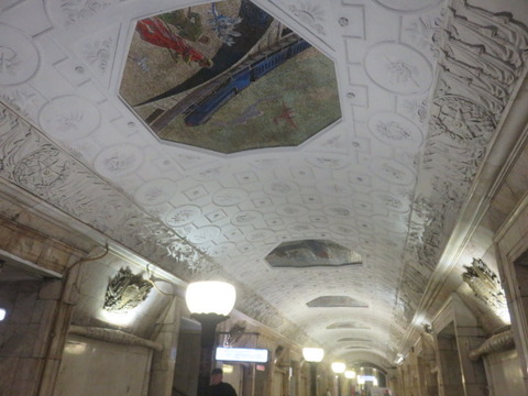 ◆労働者を表現した地下鉄芸術◆ 地下鉄2号線ノボクズネツカヤ駅のホームは、ソ連時代の面影が色濃く残る。天井には建設関係のモザイク画があり、壁···